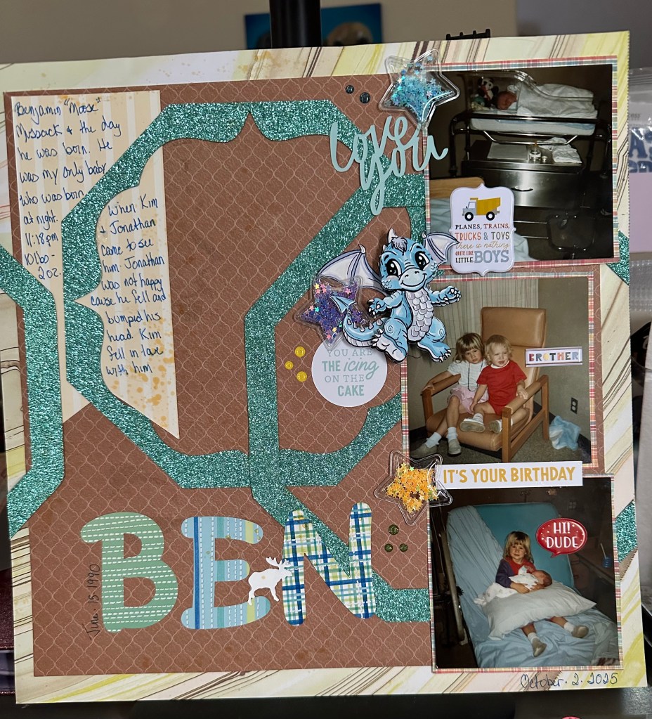 This was the sketch and layout for Day 2 of 30 Days of Scrapbooking. I shrank the sketch from a double page layout to a single page layout. The photos are of my third child, my last child. Born at a whopping 10 lbs 2 ozs. Grace of God knew we needed him.